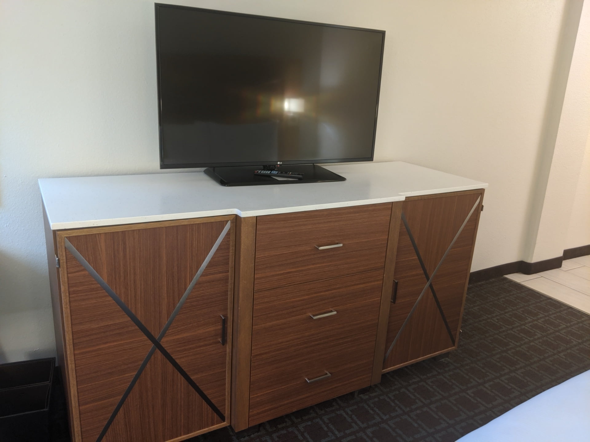The TV and dresser area. There is a small fridge inside.