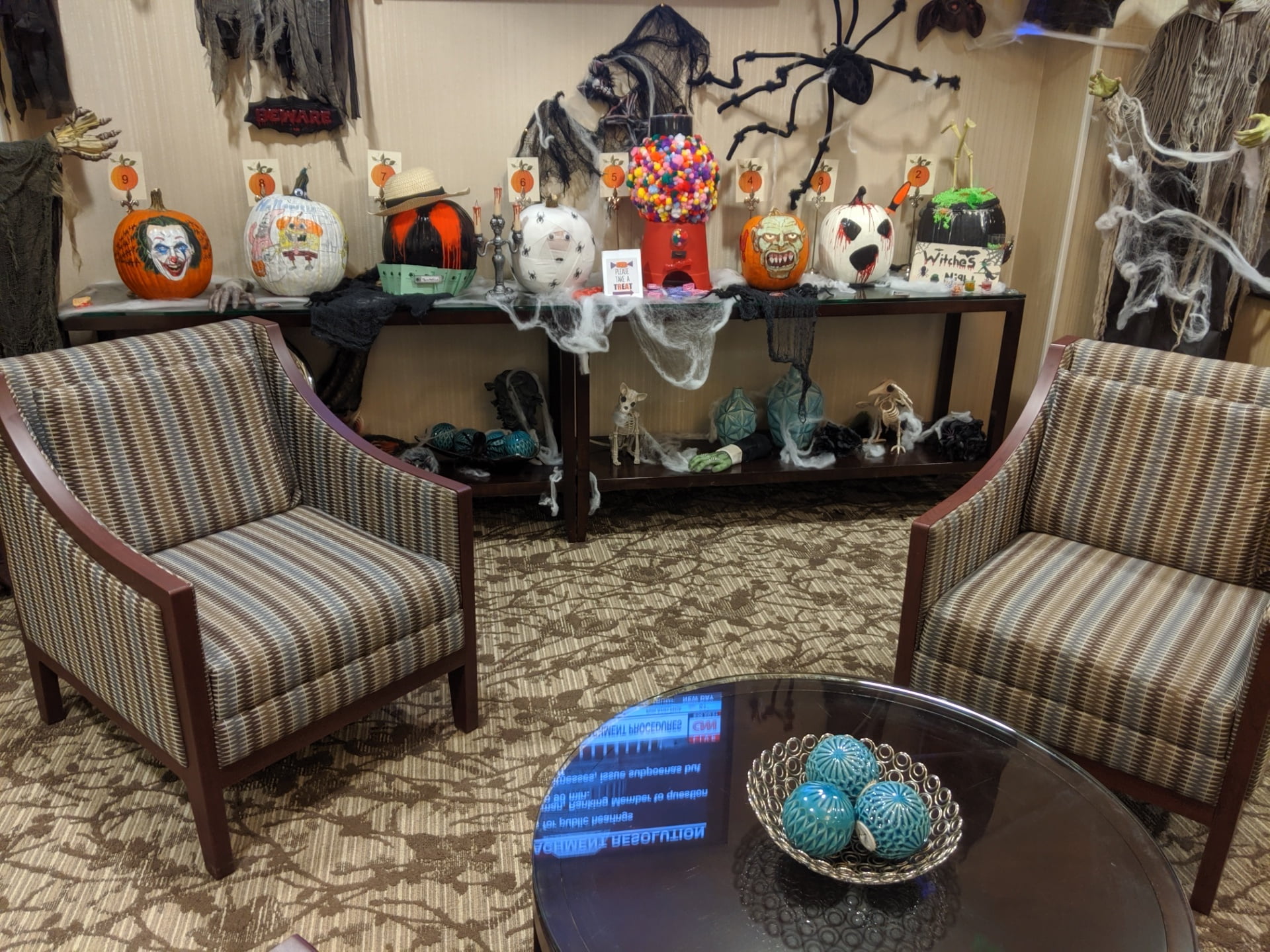 It was Halloween when I stayed, they had this setup in the lobby. You could vote for your favorite staff decorated pumpkin. I chose the white one with the black eyes and mouth on the right. It was simple and had a screwdriver stuck in the side and I found that funny.