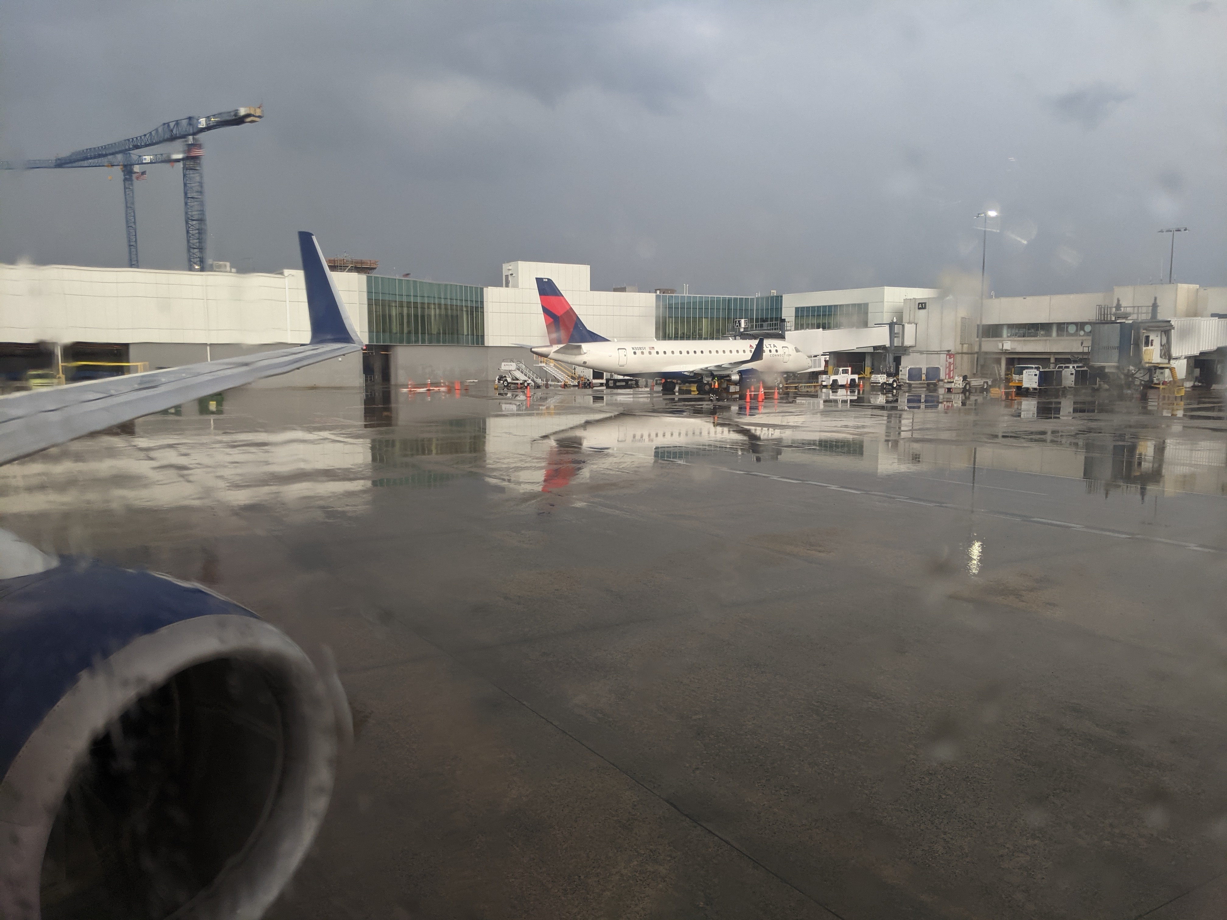 Once we pushed back the pilot told us there was a bit of a traffic jam due to the hard rain. They had stopped all departures for a few minutes so there was a back log. This actually happened to us a few years ago on a transcon Delta 737-800 when we got upgraded and we’re headed to OAK from ATL. Funny the things you remember. A few hundred flights later I can still remember what aircraft I was on, but I can’t remember what I had for dinner last night.Â