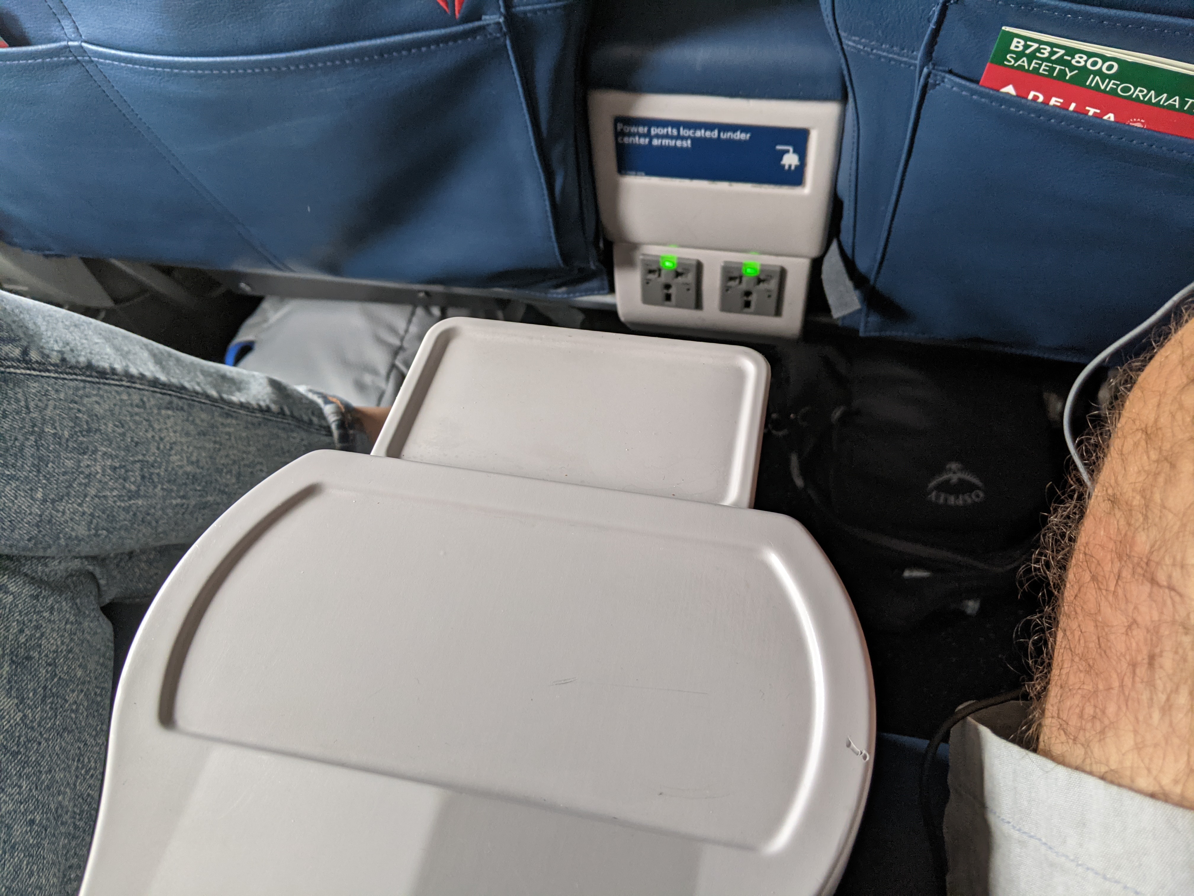 Hidden secret, these older planes have an extra tiny tray table. Great for when two people are sitting here and both want a drink and snack.