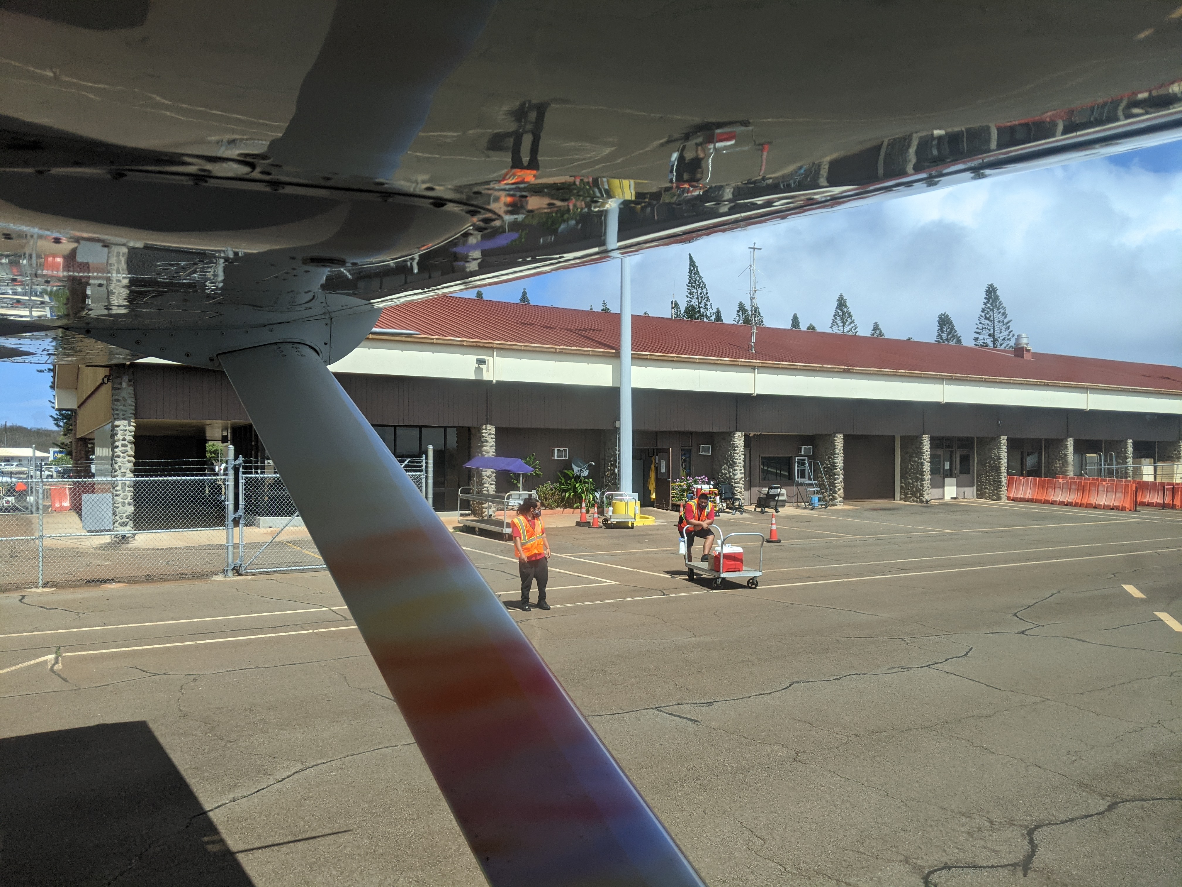 We turned off the runway and right to the terminal. The engine was turned off and the captain turned around and welcomed us to Molokai.
