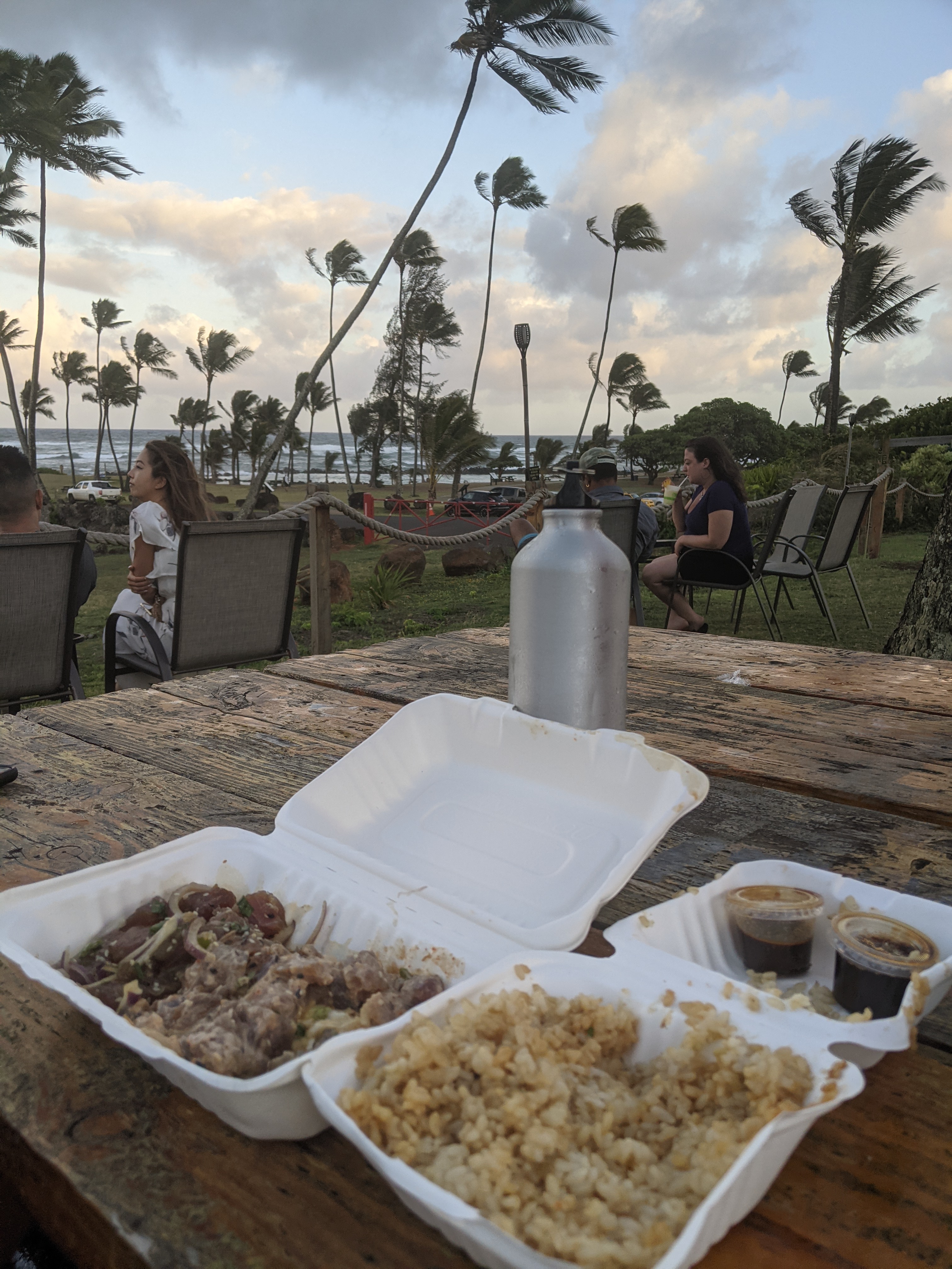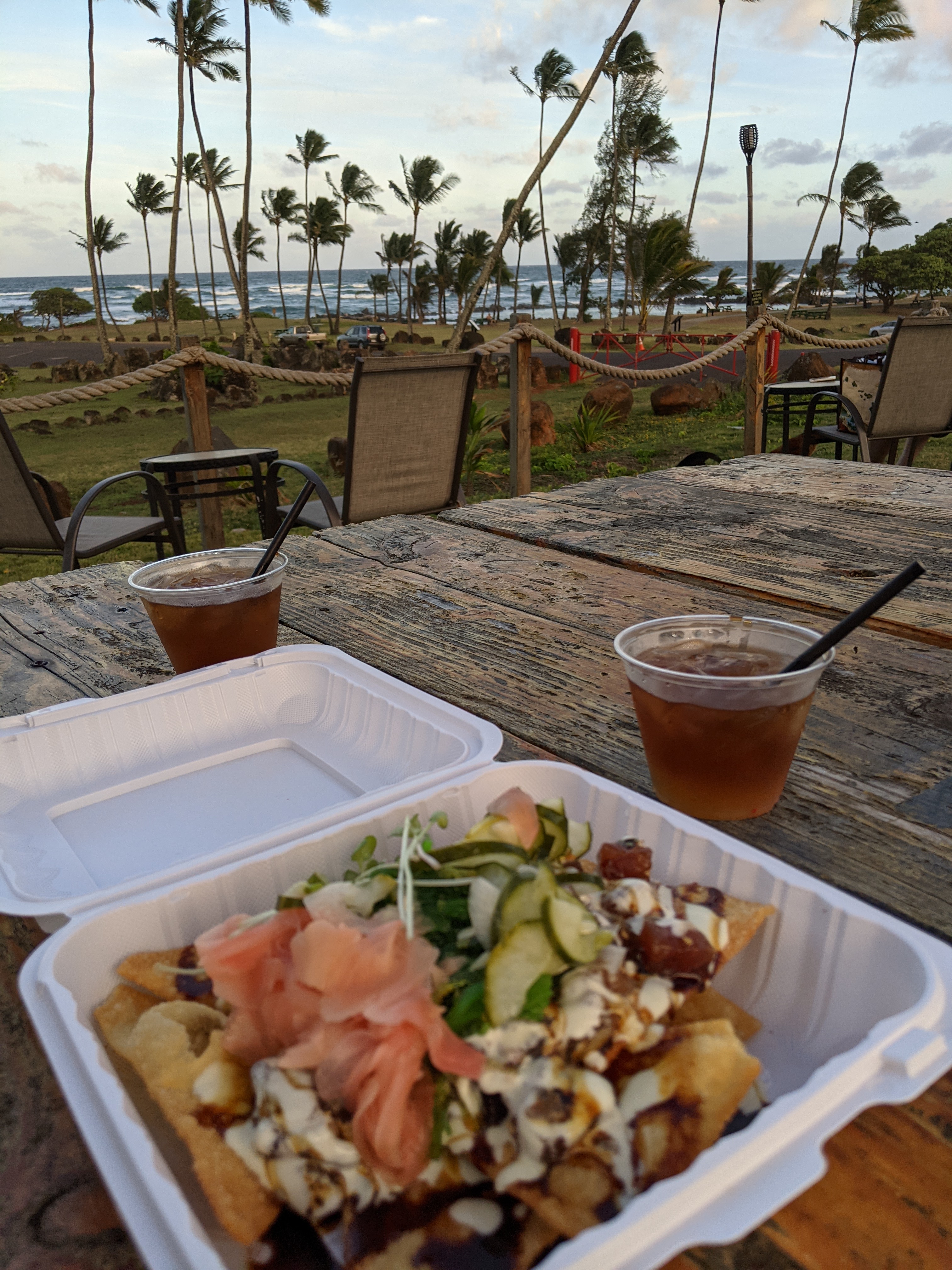 After settling down, we broke into our poke lunch and more tropical beverages.