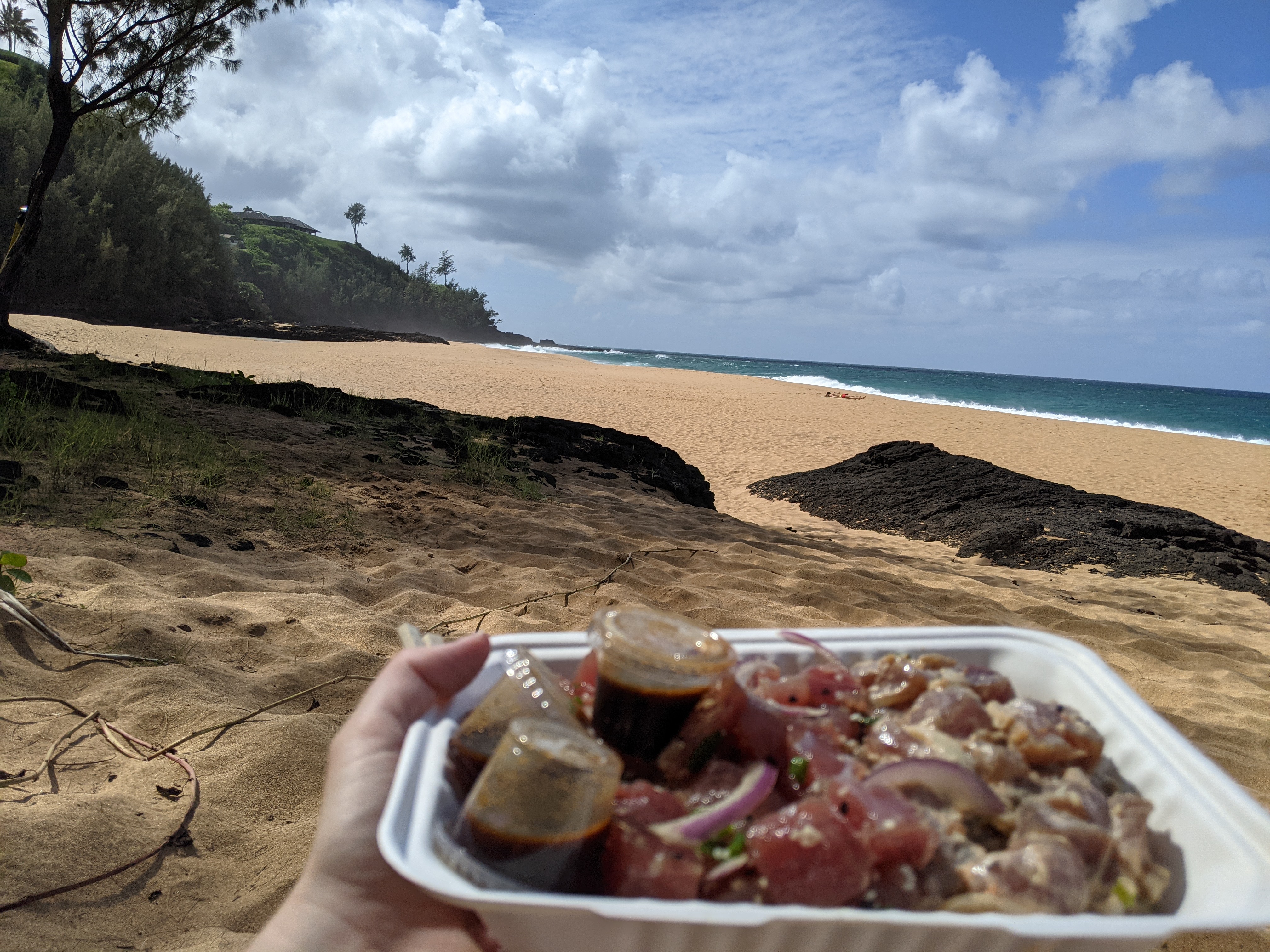 We stopped at the Kilauea Fish Market for some poke by the pound and some scoops of rice to pack up and bring to eat on the beach. The poke was expensive but definitely worth it, as I think it was the best poke we had all trip.