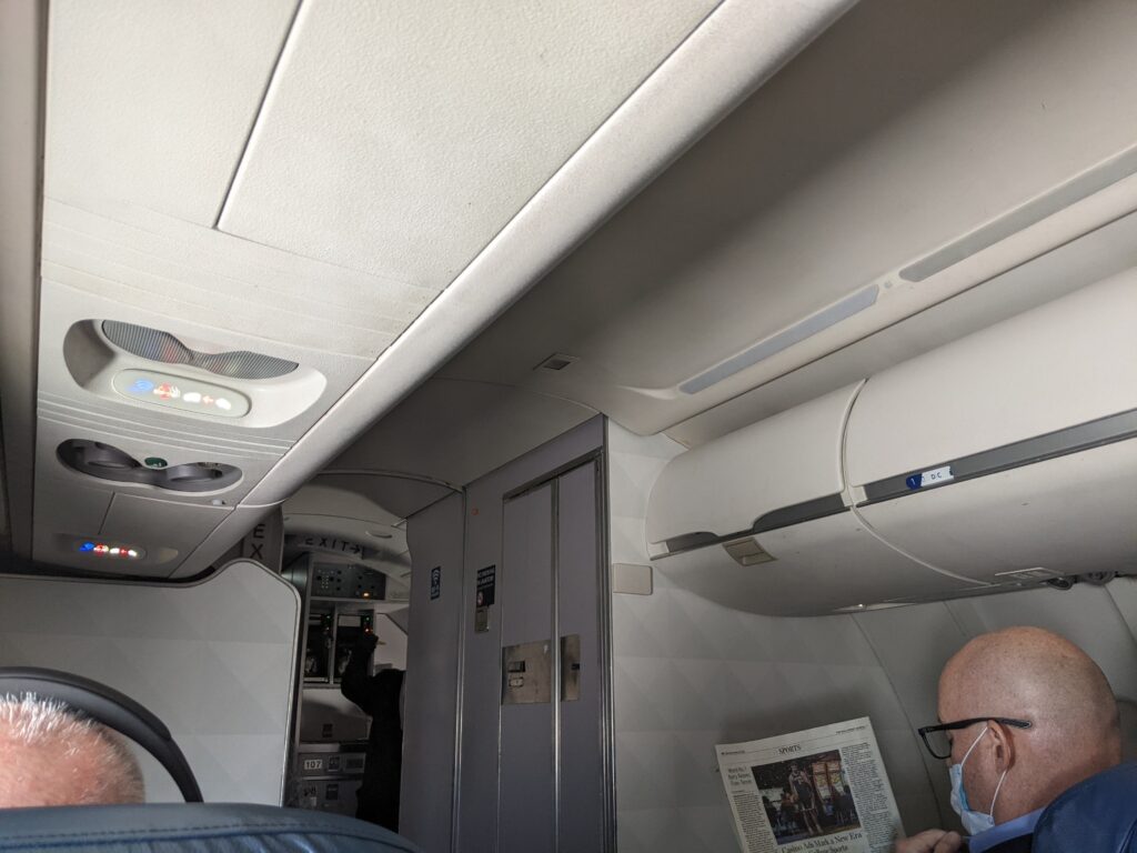 The pilots told us our flight time would be 1:30 minutes from takeoff to touchdown. The flight attendants also gave their welcome. My coat was collected and hung in the closet. Usually I’ll just stuff it in the overhead after boarding, but they are jam full today.