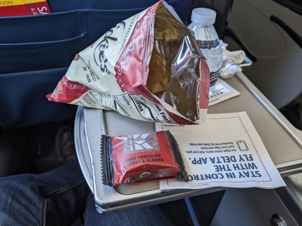 The flight attendant came around and offered drinks and snacks. This flight is only 90 minutes so nothing substantial is offered. I got a water along with a bag of chips and a snack bar.