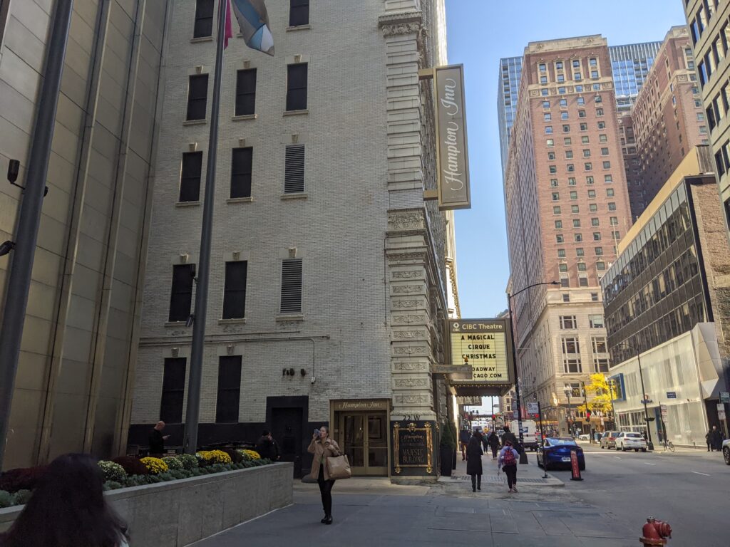 The Hampton Inn Chicago is easy to spot from the street. It’s right on Monroe St. The large marquee for the CIBC Theater is an easy spot on the front of the building.
