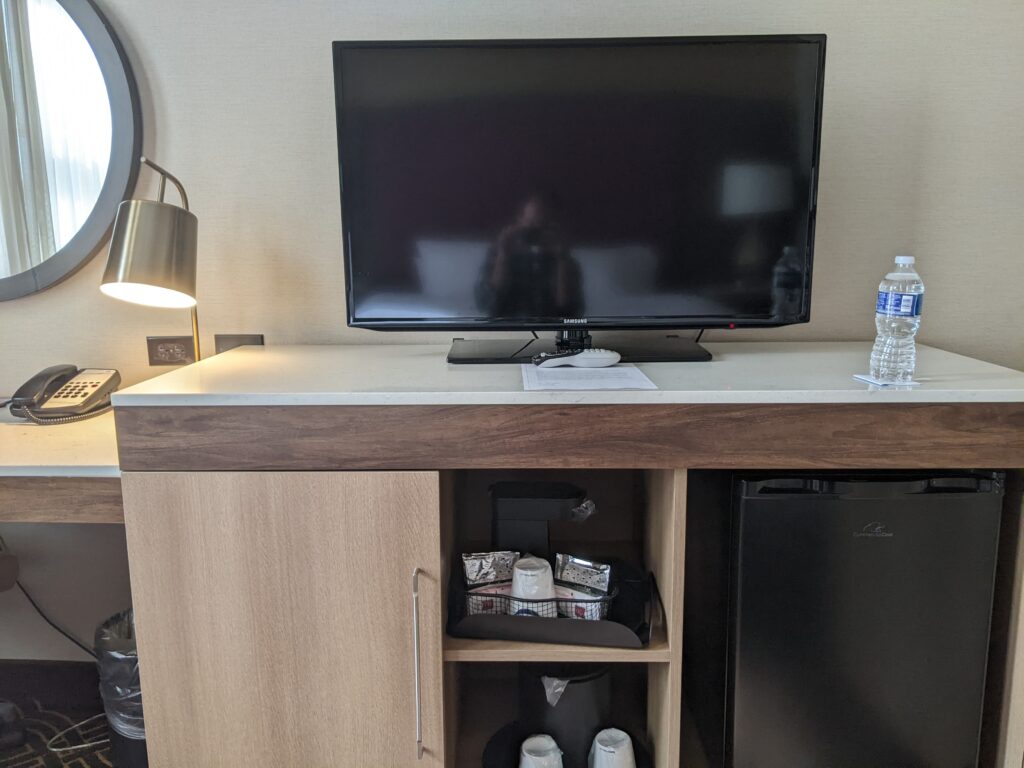 Opposite of the bed is the TV. In the TV stand is a mini-fridge along with coffee facilities.