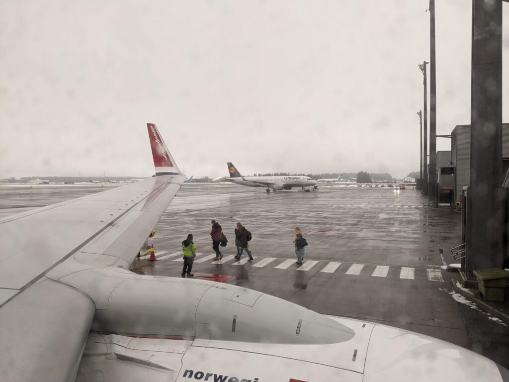 We arrived at our gate just when our Norwegian 737-800 arrived. Perfect timing. It’s a little cold and raining here in Oslo, but nothing too terrible.