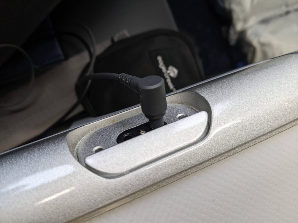 To my left was a little storage compartment. I stuffed the Delta provided headphones in here, I used my Sonys. This is also where the power port is located. It has both 110v via a universal plug and USB.