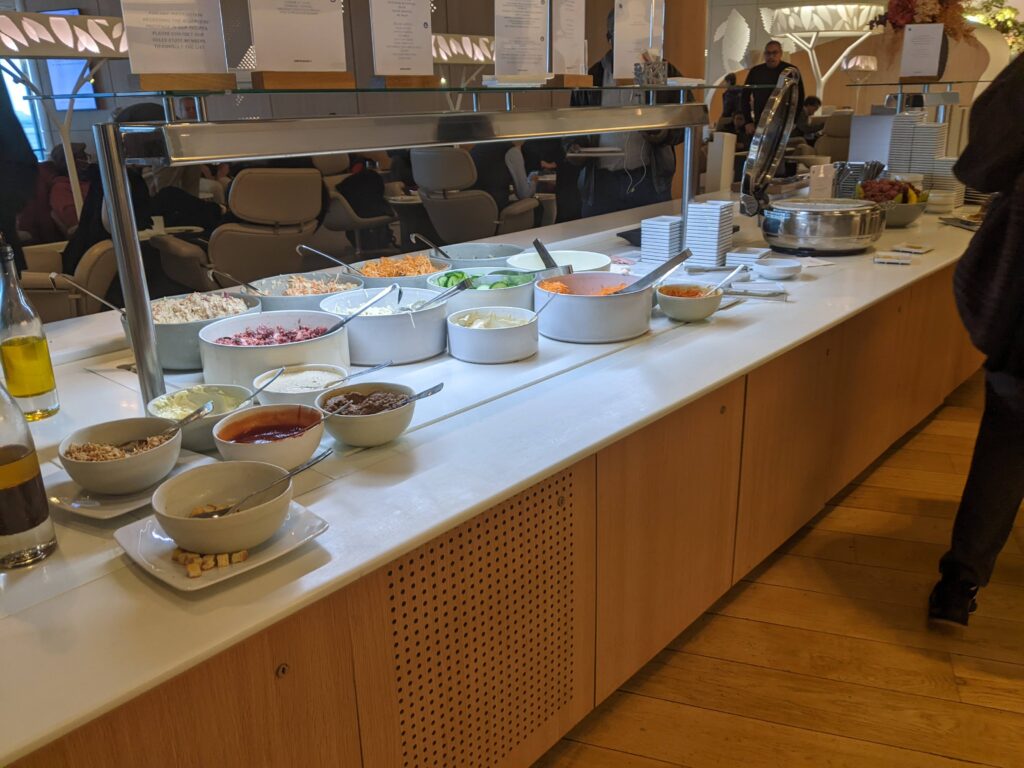 There was a salad selection, nothing ground breaking. There were also 2 different hot items. A pasta and then also a chicken dish. I didn’t have either as I wasn’t that hungry and we’d get a meal on our upcoming flight.