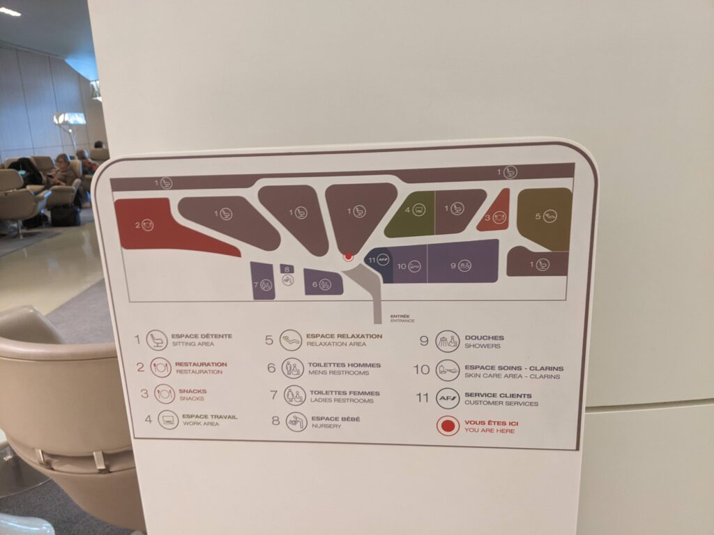 The Air France Lounge here at CDG Terminal 2E is huge. You can see the layout and amenities. Most of the area is seating, but there are a few special areas including the Nursery for infants, A spa area, and a shower area. There are also 2 buffet areas, a kids space, and an Air France Help Desk. All in, this lounge is huge.