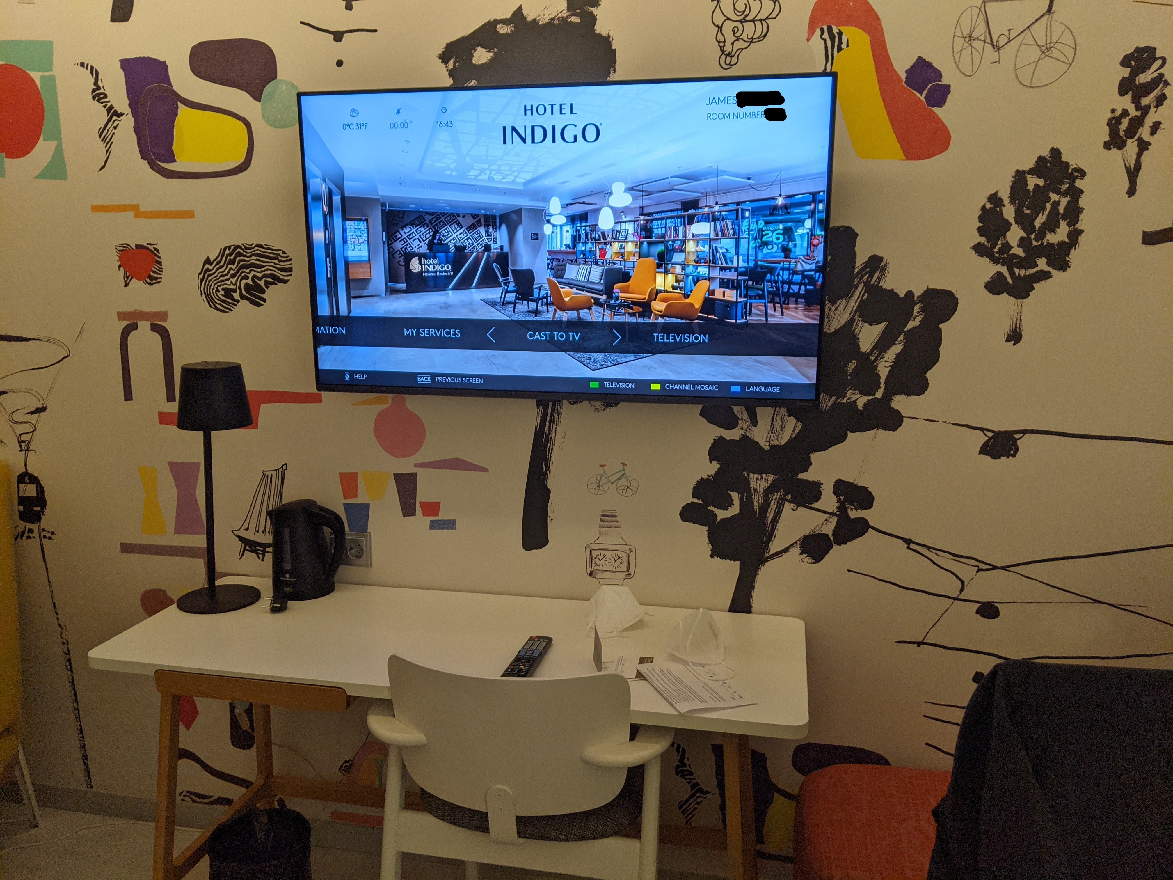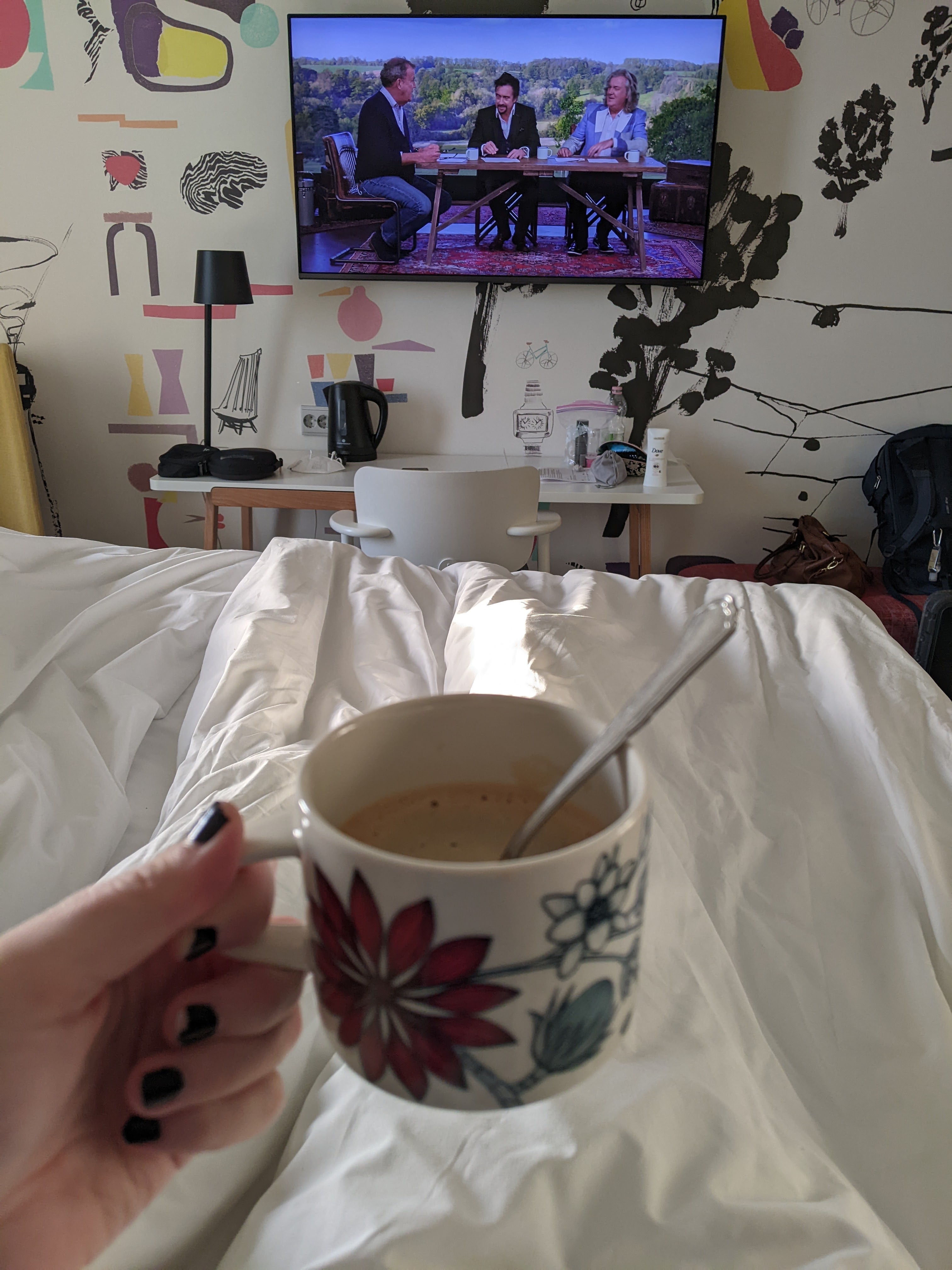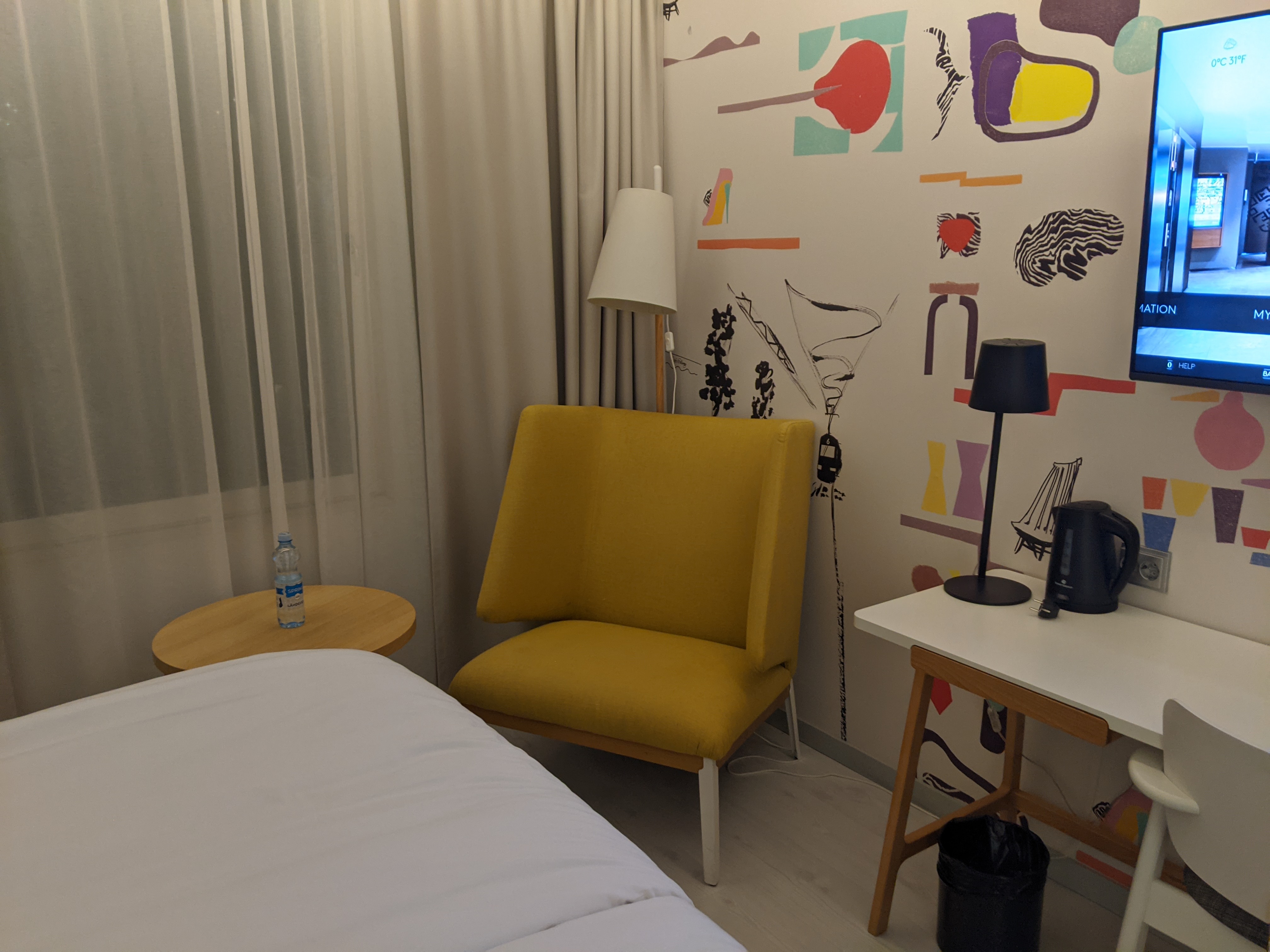 Opposite from the bed was the TV and small desk. The TV had a nice casting feature so we could watch content from our phones. There’s also an electric kettle here on the desk. The wallpaper had lots of Finnish hints and Helsinki land marks. Val really enjoyed it.