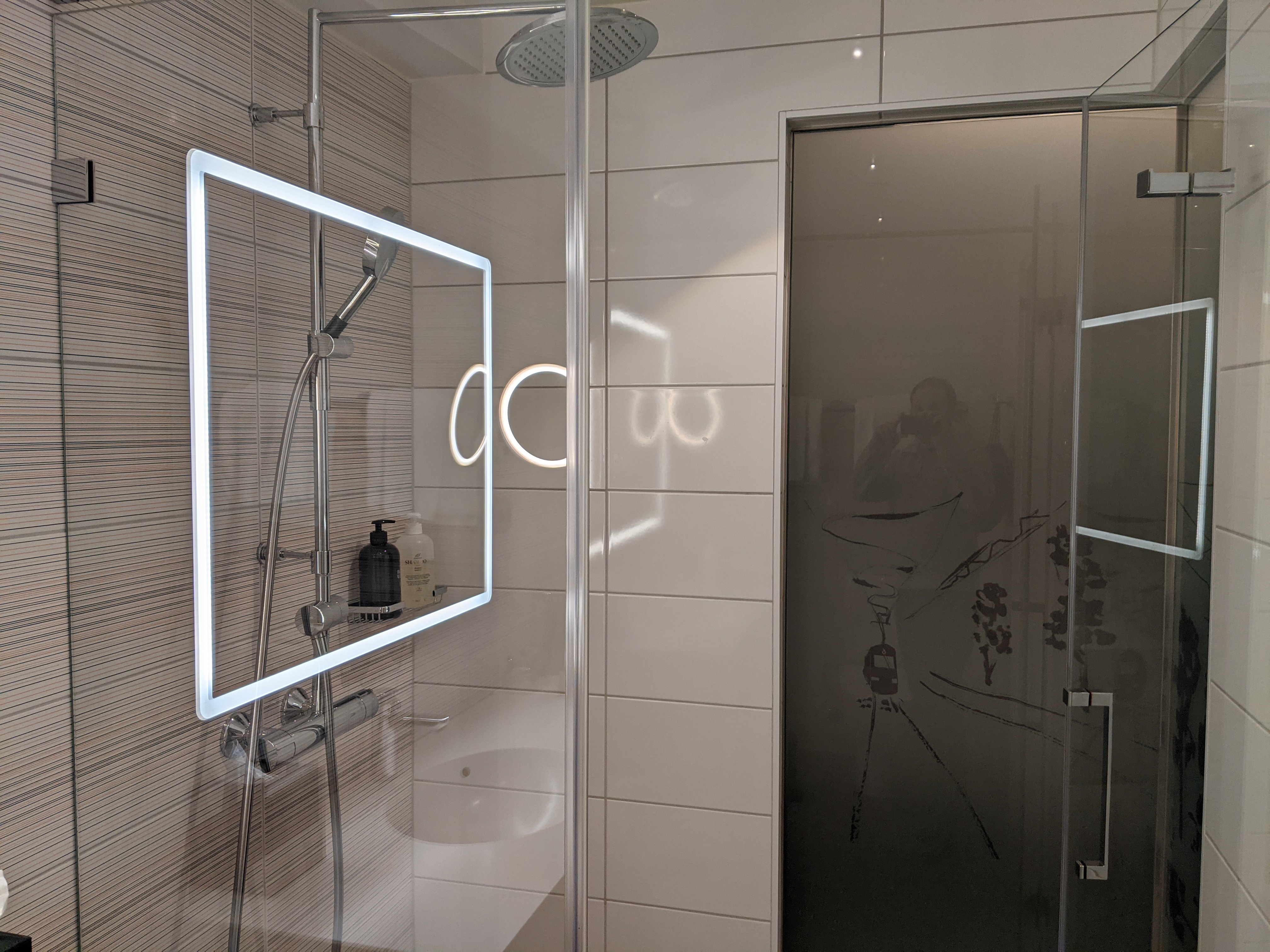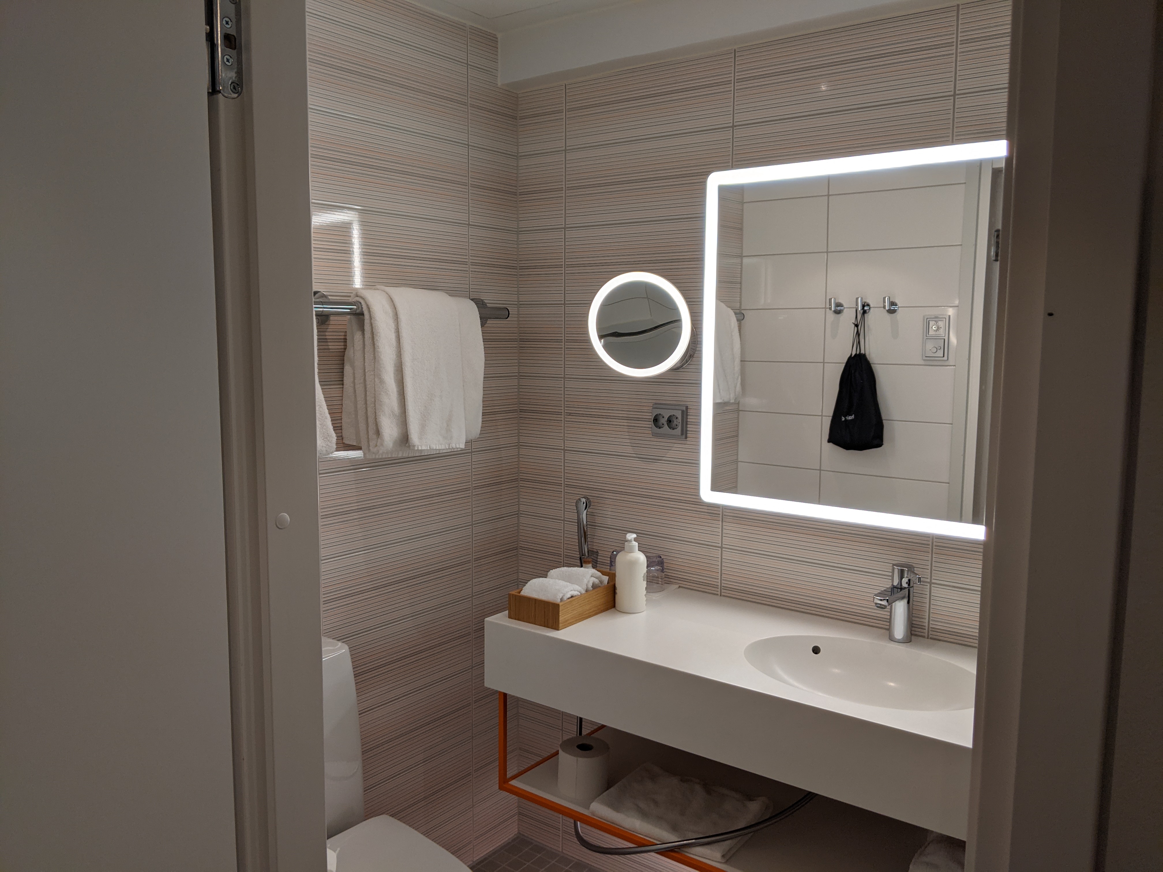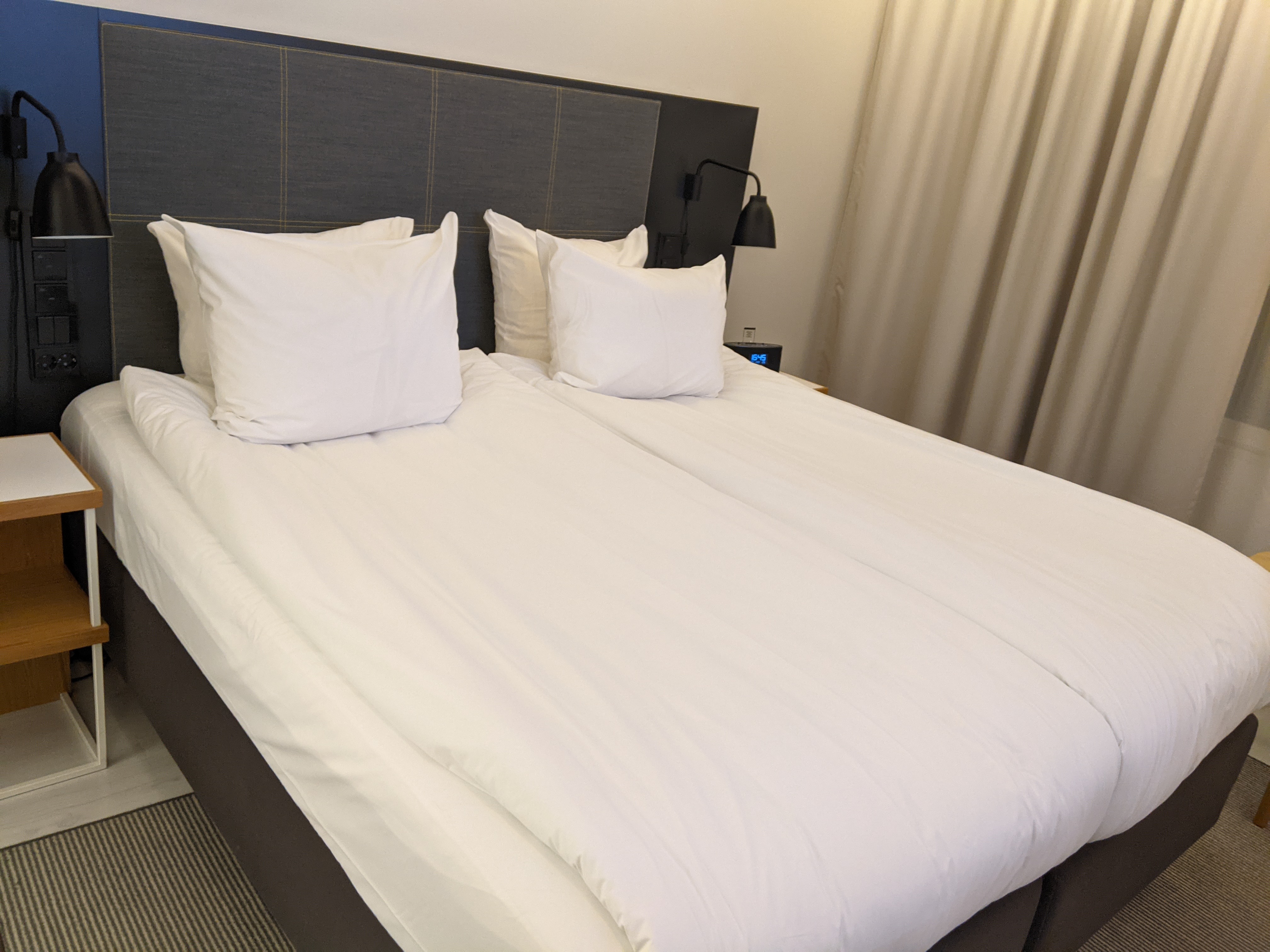 The bed was extremely comfortable. In the style of much of Northern Europe, there are two separate comforters, one for each person. There are plenty of lights and power outlets near the bed.