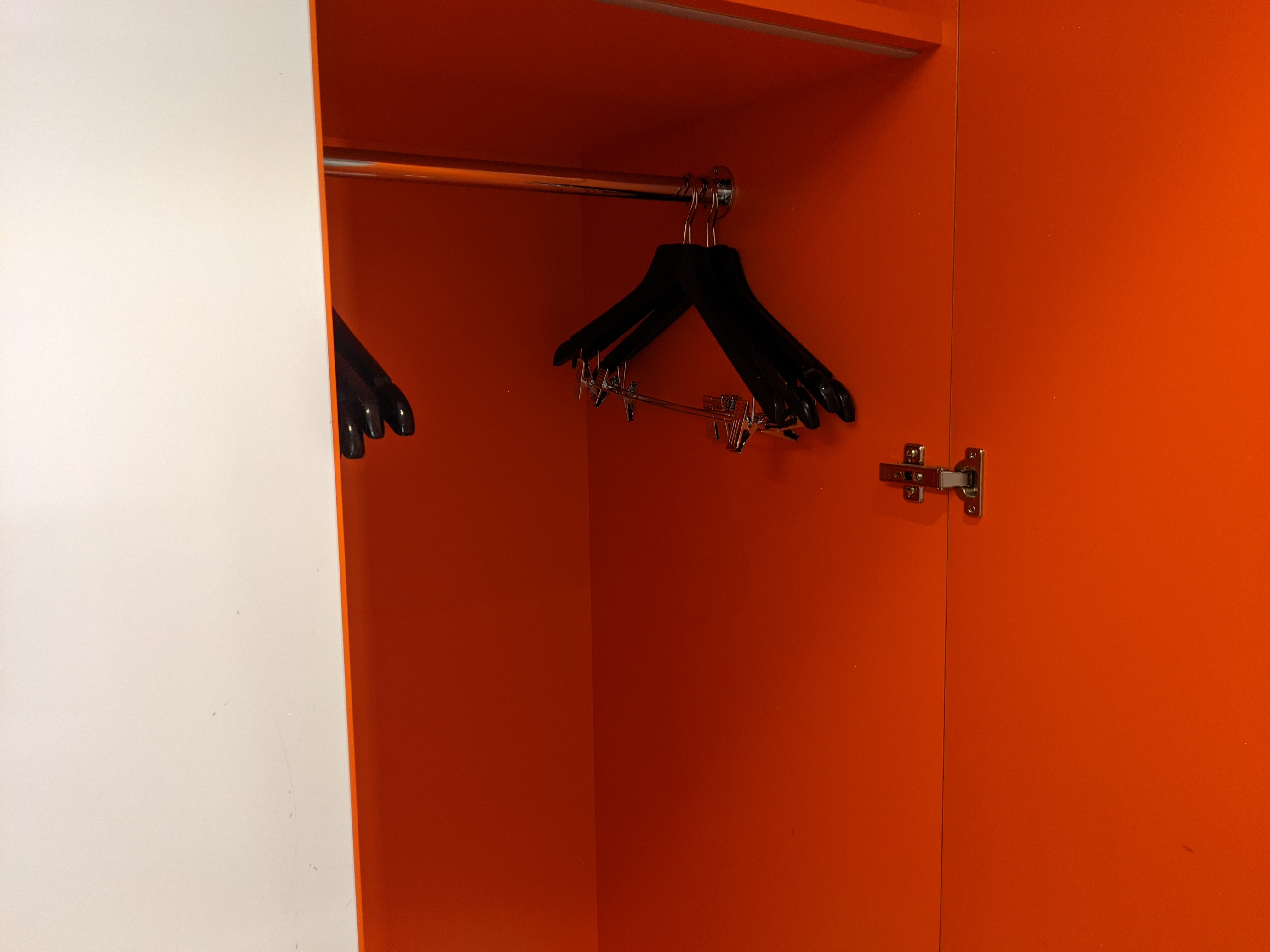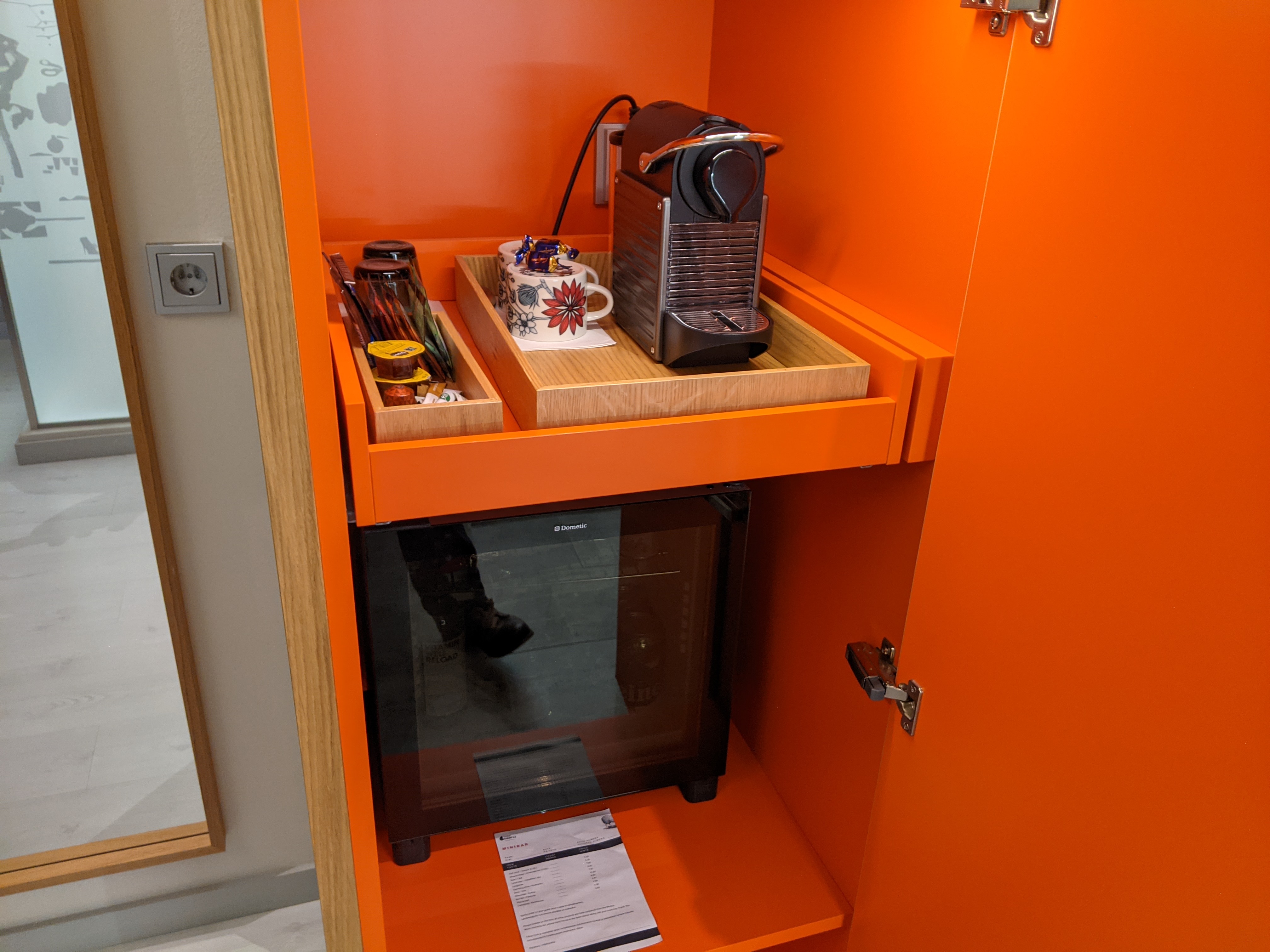 The closet here in the Indigo Helsinki is orange, and I mean really orange. Inside is a Nespresso machine, mugs, coffee, tea, and a small fridge.